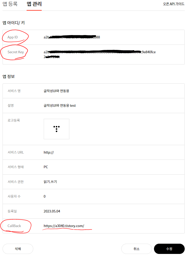 앱관리 > 설정으로 들어가시면 등록때 작성했던 내용과 연동할때 사용할 정보가 생성된것을 확인할수 있습니다.