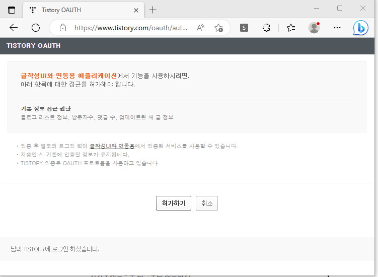 로그인하거나 로그인되어 있다는게 확인되고 "허가하기" 버튼을 클릭하면