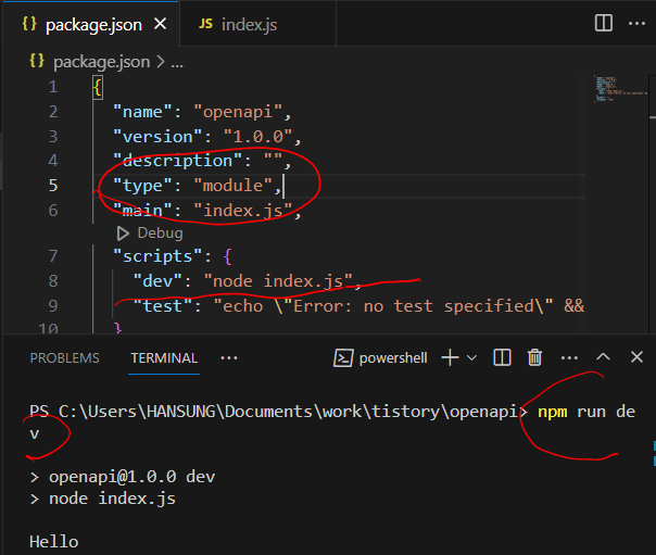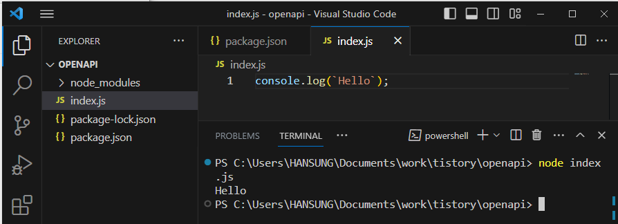 index.js파일을 생성하고 node에서 실행해봅니다.