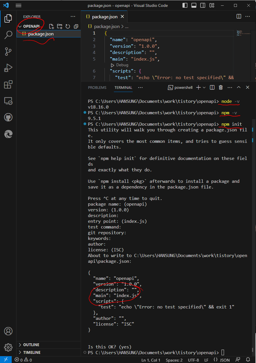 Terminal 창을 열고 npm init 를 실행해서 package.json 파일을 생성합니다.