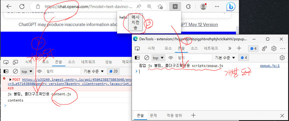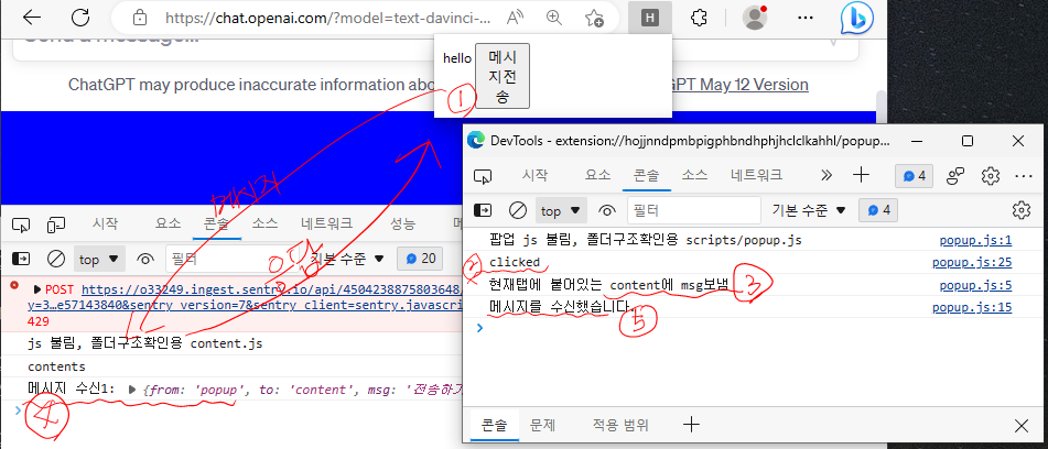 이번글에서는 브라우저와 특정 페이지의 contents에 메시지를 전송하고 처리하는 예제를 보았습니다. 다음에는 jquery를 추가해서 content, popup쪽에서 사용하는 방법과 popup에서 작성되어 온 메시지를 기존 gpt 대화창에 입력하는 부분을 진행해 보도록 하겠습니다.